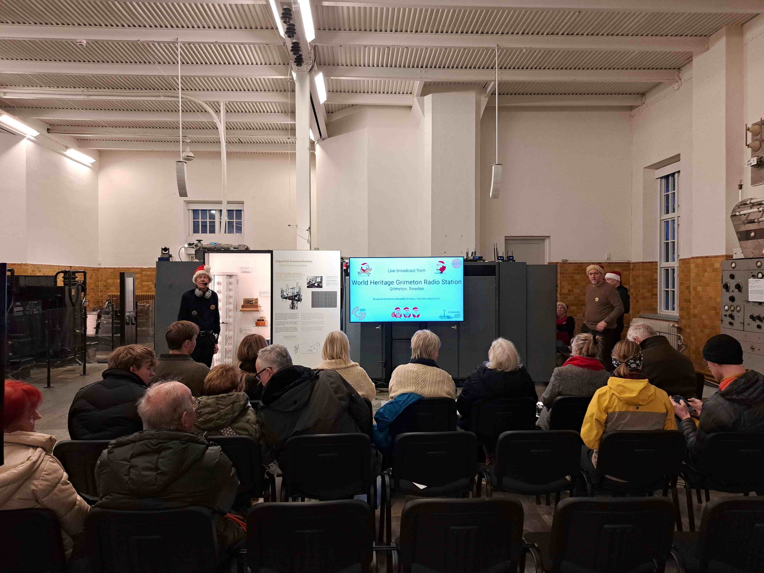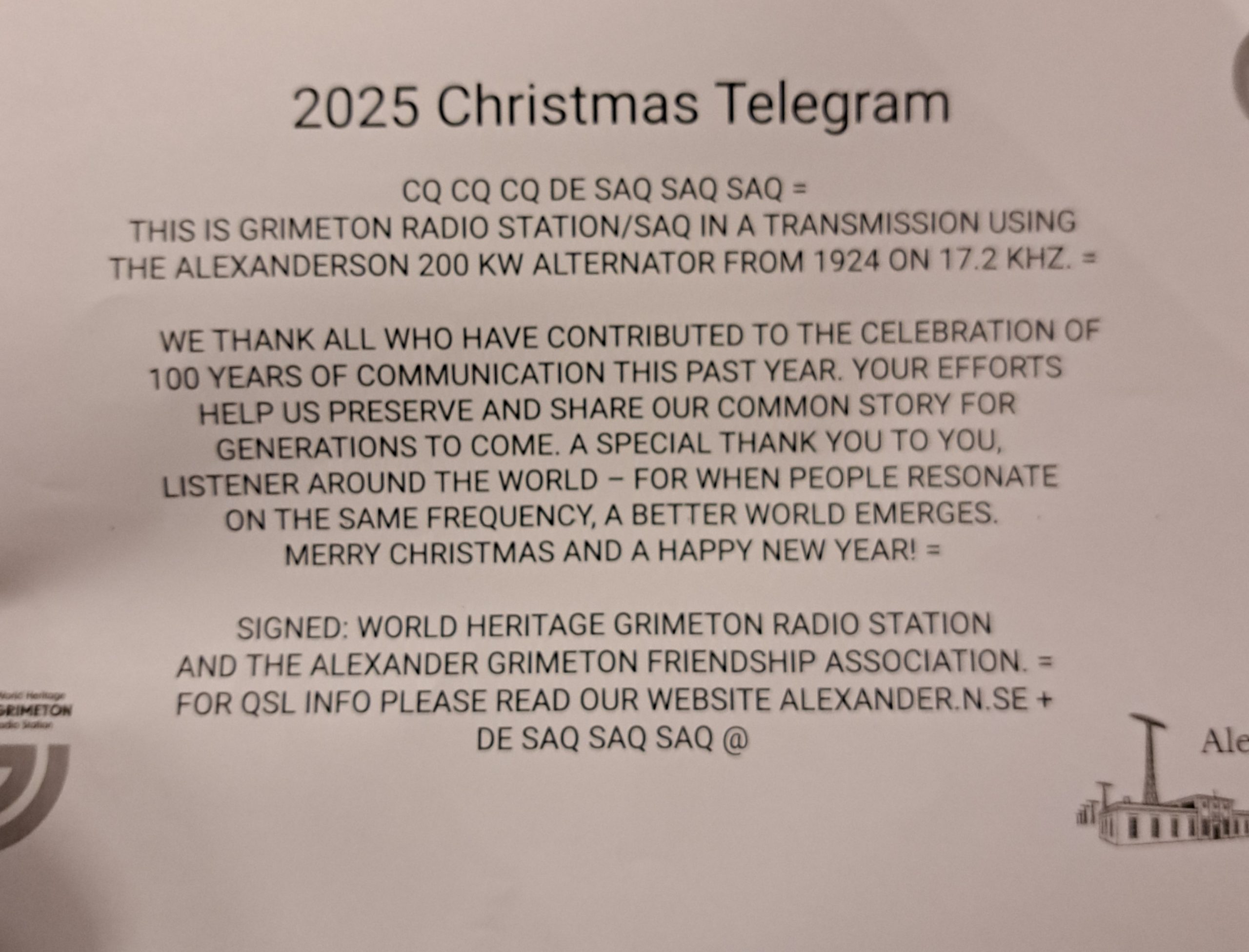 Ein besonderes Weihnachtsgeschenk war für mich der Besuch des Längstwellensenders in Grimeton am 24.12.2025. Jeweils am Morgen des 24.12. wird von SAQ eine Weihnachtsbotschaft ausgestrahlt. Im Morgengrauen fanden sich um ca. 100 Mitglieder der Alexanderson Association und Förderer in der Maschinenhalle, um live dabei zu sein. Einige Tage zuvor hatte das SAQ-Team noch den Start der Anlage getestet, der Test musste aber abgebrochen werden, da technische Probleme auftauchten. So war die Spannung groß, ob der Sender anlaufen und auch seiner Sollfrequenz von 17.2 kHz einschwingen würde.